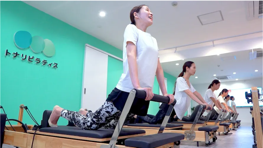 マシン(リフォーマー)のバネの力を借りるので、ガチガチの「腸腰筋」や「前もも」を気持ちよく伸ばしながらトレーニングできます。運動が苦手な方でも無理なく動けるのが特徴です。
