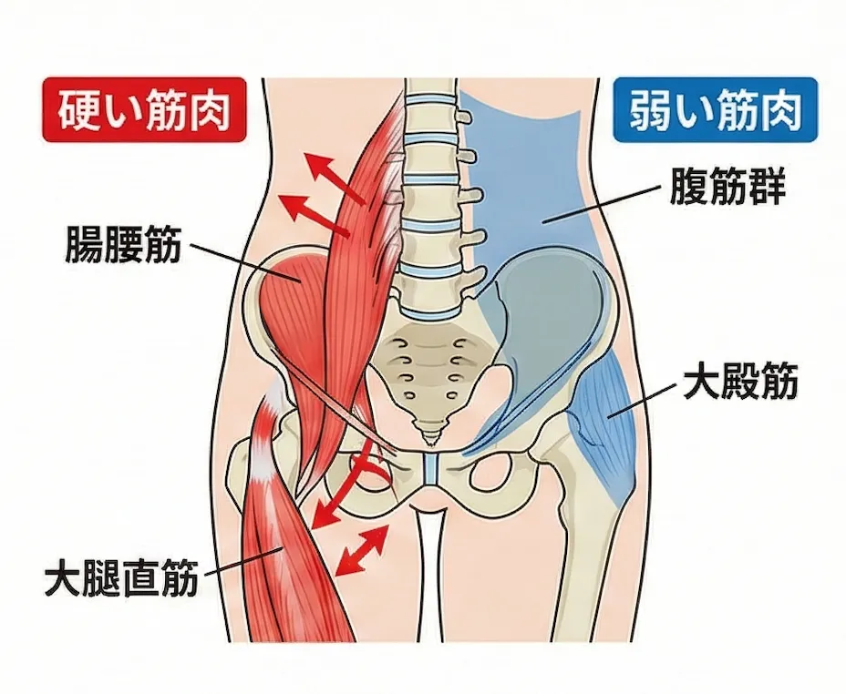 骨盤が前に傾くことでさらに筋肉が張る…という悪循環に陥っている可能性があります。